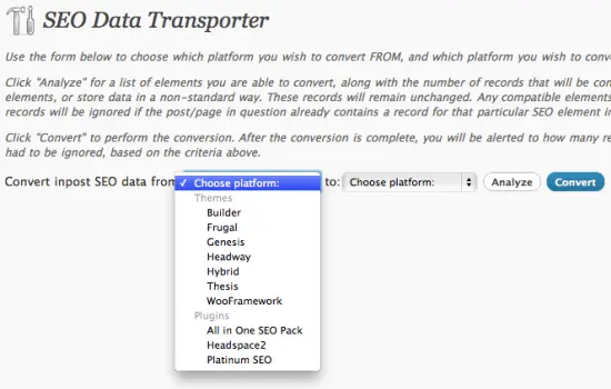 Using SEO Data Transporter you can transfer the SEO settings / data from one WordPress plugin or theme to other very easily. You just need to install and activate SEO Data Transporter plugin. Then from the Tools > SEO Data Transport page you have to select the platform from which you want to move and also the platform which you wish to move. Clicking on the “Convert: button will make this happen. It also provides “Analyze” button with which you can find what all records are compatible.